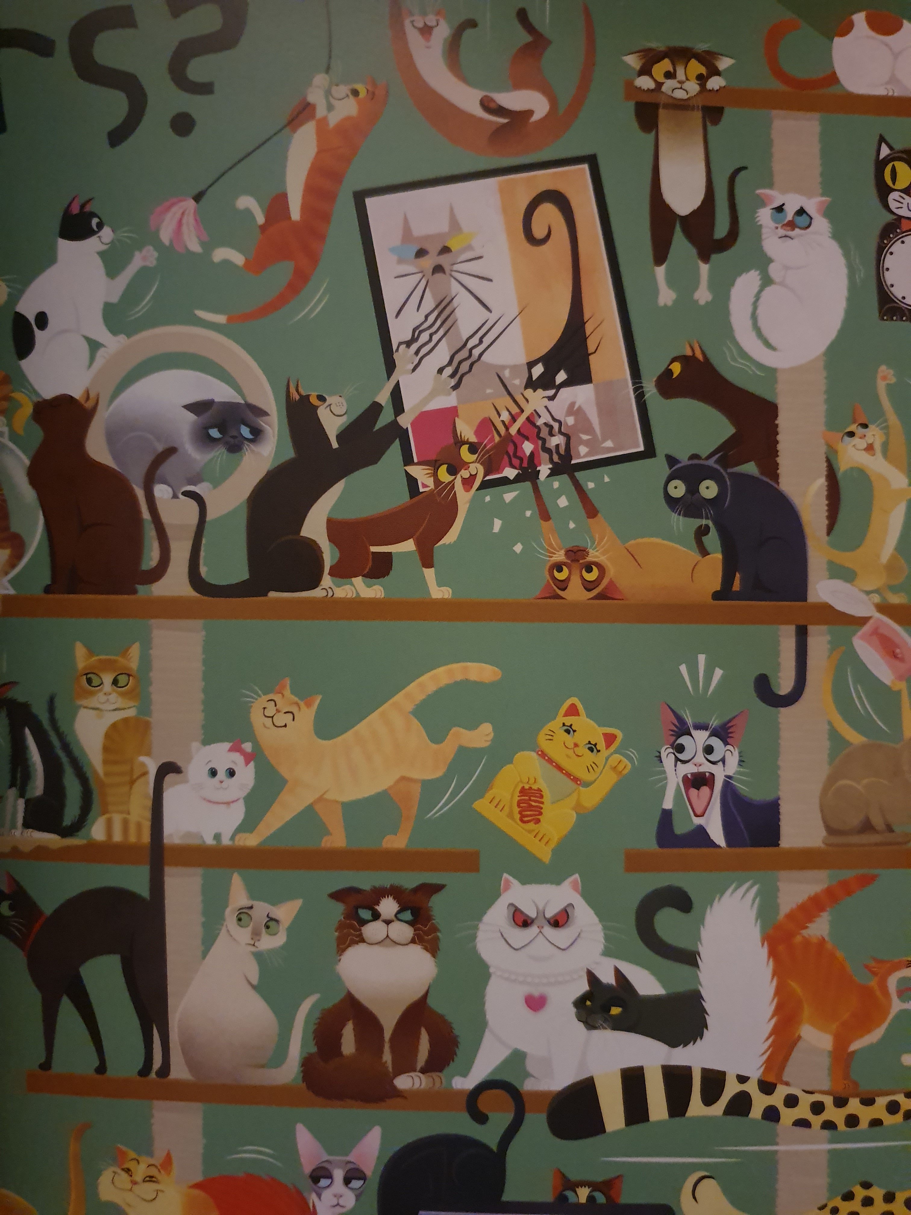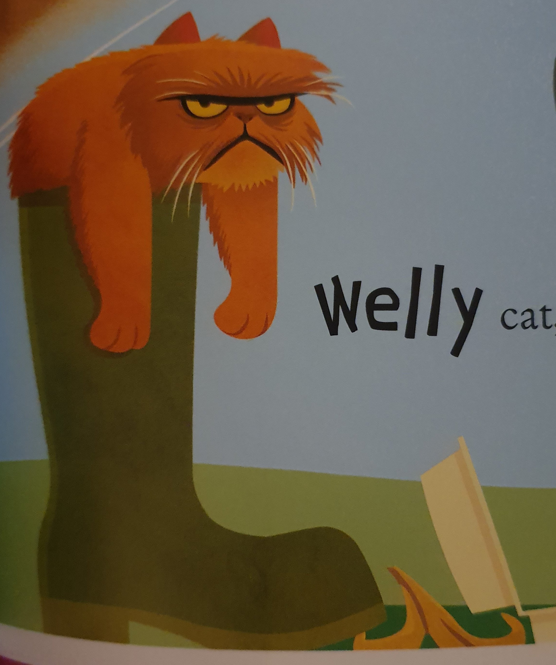 The final double page extravaganza features all 100 cats and we always end by spotting our favourites (the little monster likes the baby and I like the grumpy welly cat) and a game of “Spot the cat” – find the cat wearing sunglasses/dancing/smiling etc.