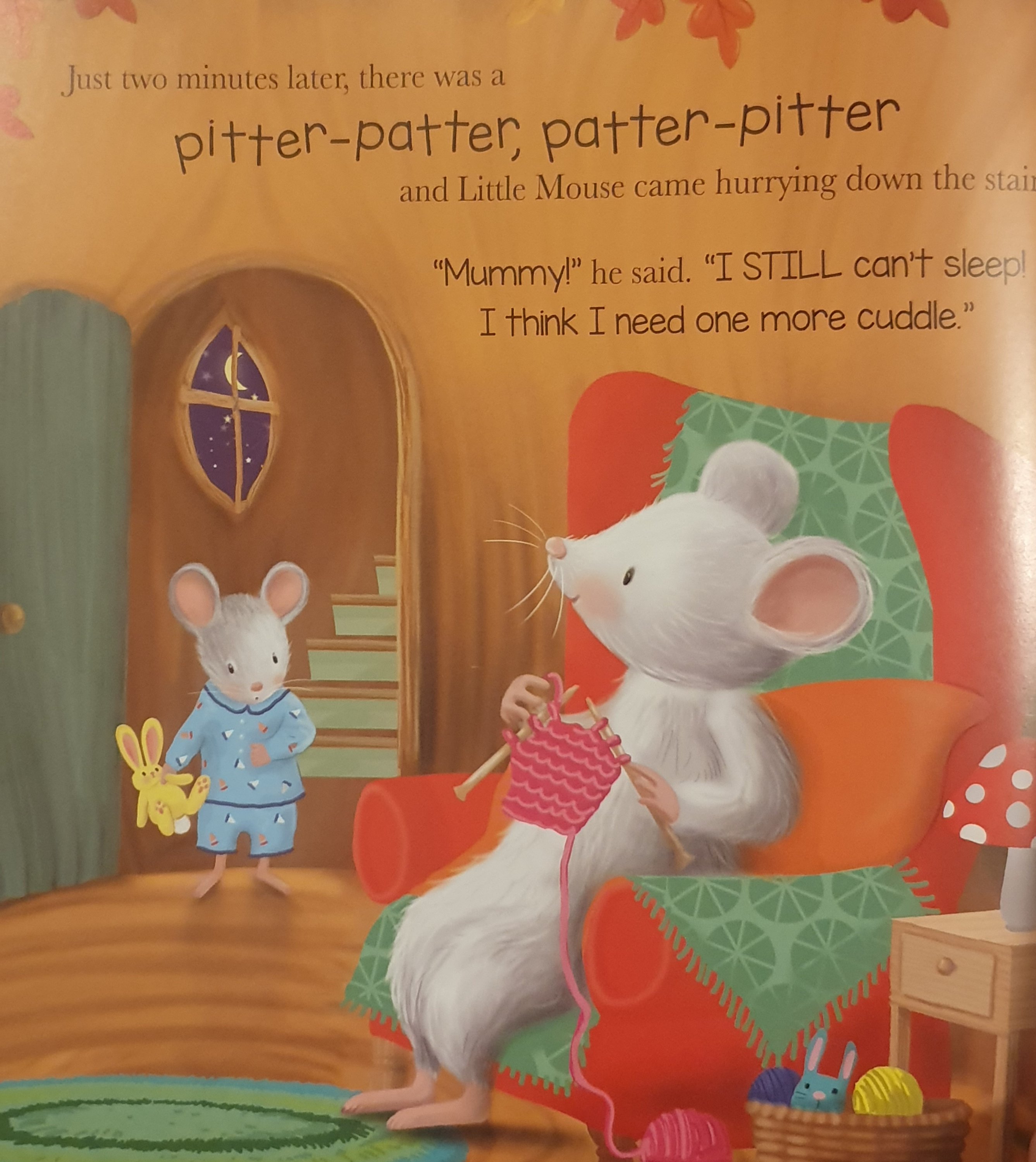 Little Mouse is exhauted but doesn’t want to go to sleep. He tries all of the tricks to stay up for as long as possible. He has a bath, a snack, a drink, a story and a lullaby. Just when Mrs Mouse thinks he is fast asleep she hears a pitter-patter on the stairs and Little Mouse is back down.