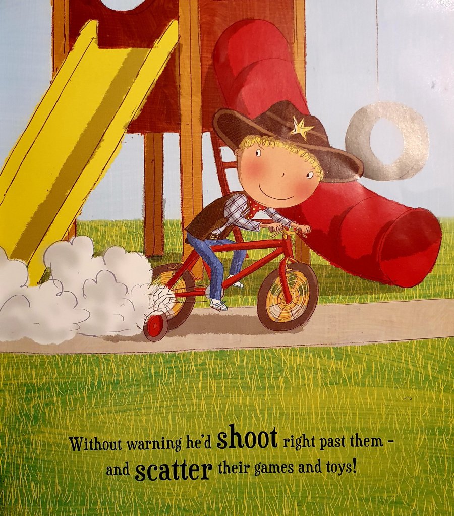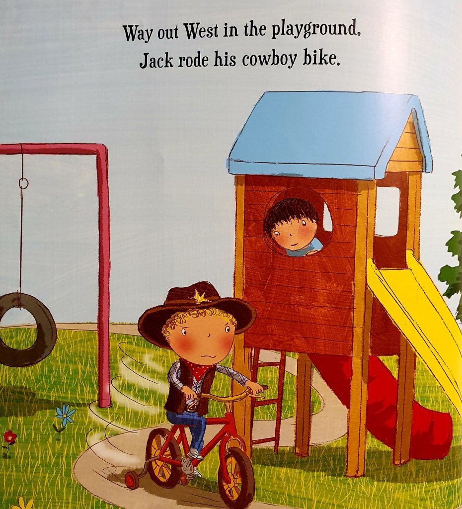 Jack is a cowboy. But instead of being brave an true, when he’s out West in the playground he is mean and unfriendly. He races his scooter passed children, takes their toys and makes them cry.