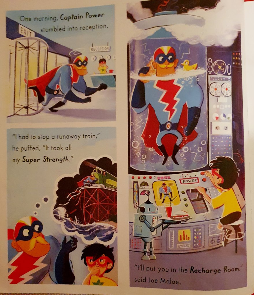 This is a fun, comic strip style book. The illustrations are really detailed and there is a lot to spot in the background of the pictures. The rooms in the hotel are great fun and we’ve had some very in depth conversations about what kind of toilets superheroes use.