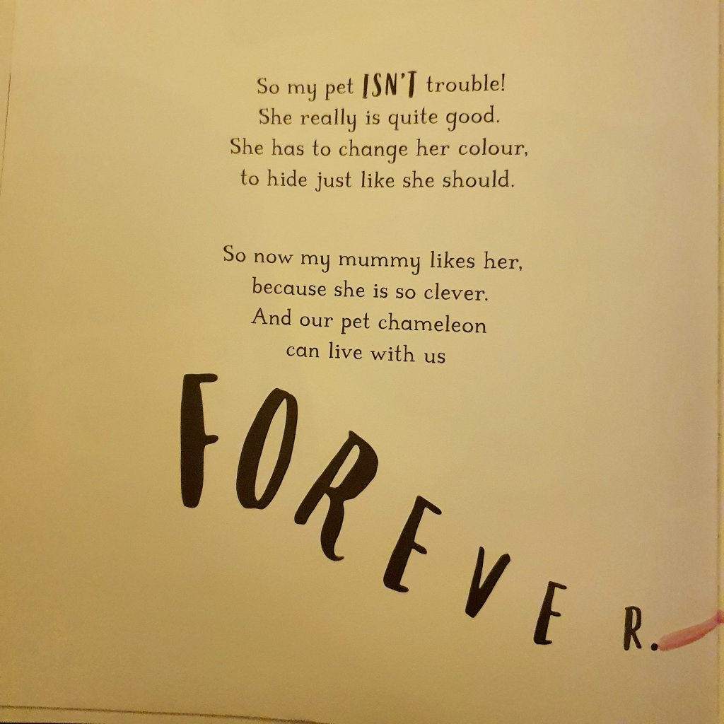 The little girl in the book has a pet chameleon who is proving quite tricky. She’s very cute but very troublesome and keeps disappearing.