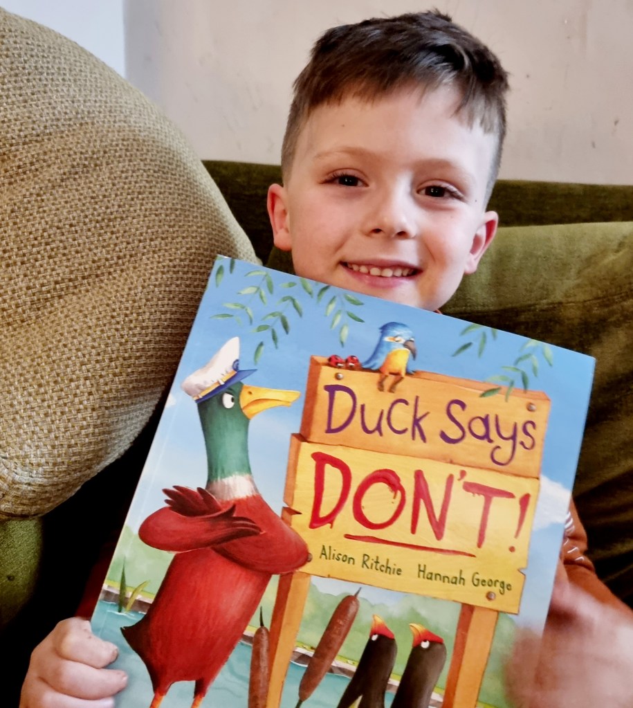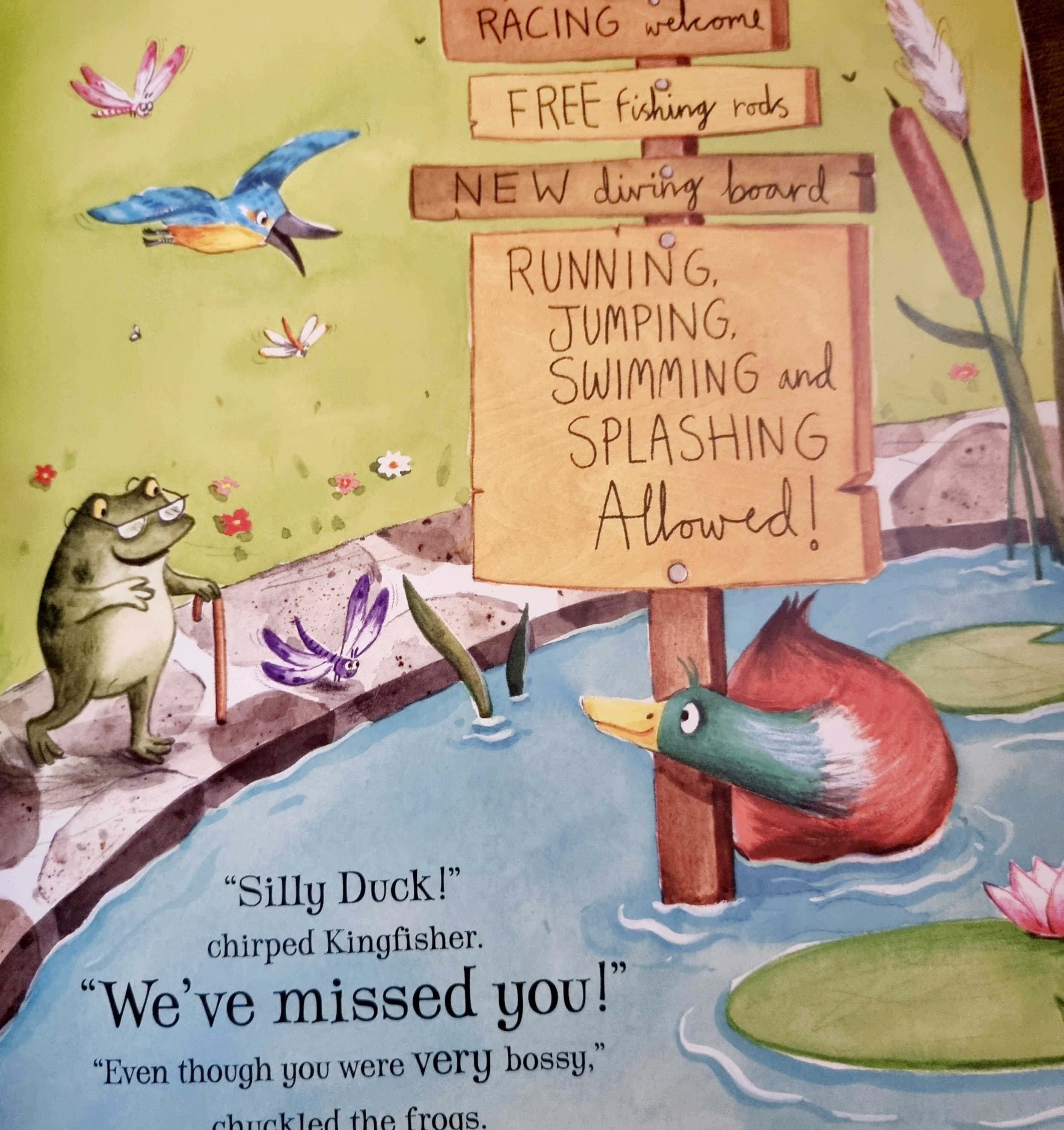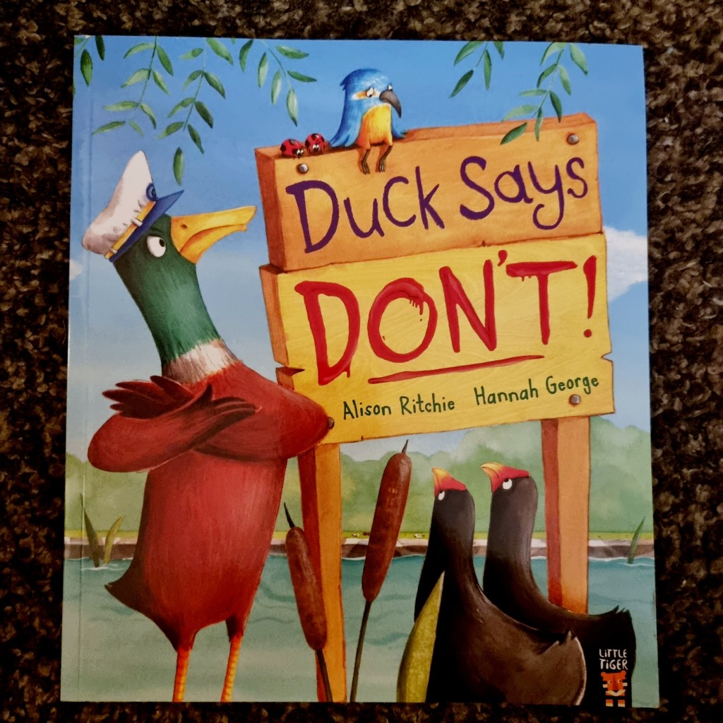 When Goose goes on holiday she gives Duck the responsibility of looking after the pond. Before you know it he has turned into the fun police and putting up Dolores Umbridge style signs stopping the frogs from diving, the kingfisher fishing and the the dragonflies chasing each other.