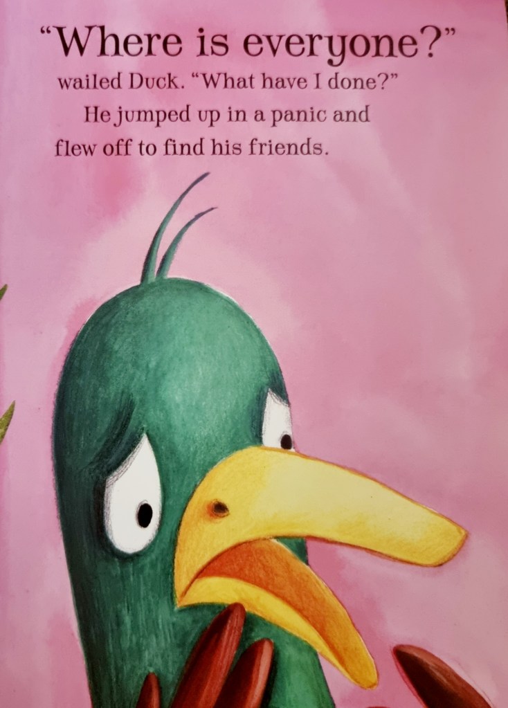 Before long Duck can relax and enjoy the peace and quiet of the pond. Except he’s all alone and it is far too quiet. Fed up with the rules, all of the animals have gone to play in the meadow.