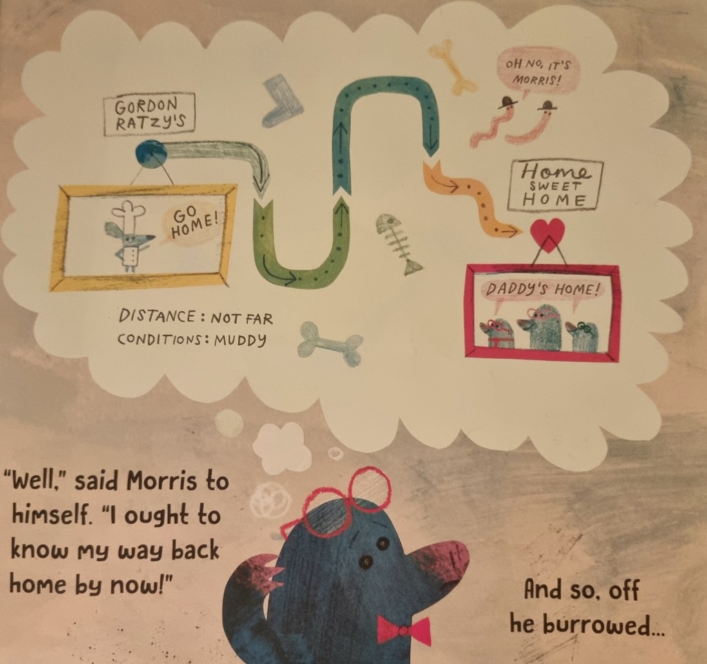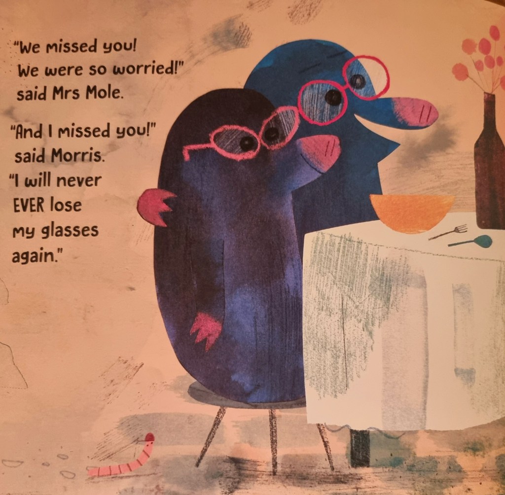 “Mrs Mole, I’m homeeee!” he sings … as he burrows right into some poor unsuspecting rabbit family’s hole. Oh dear. Without his spectacles, Morris really can’t see a single thing – how will he ever get home?