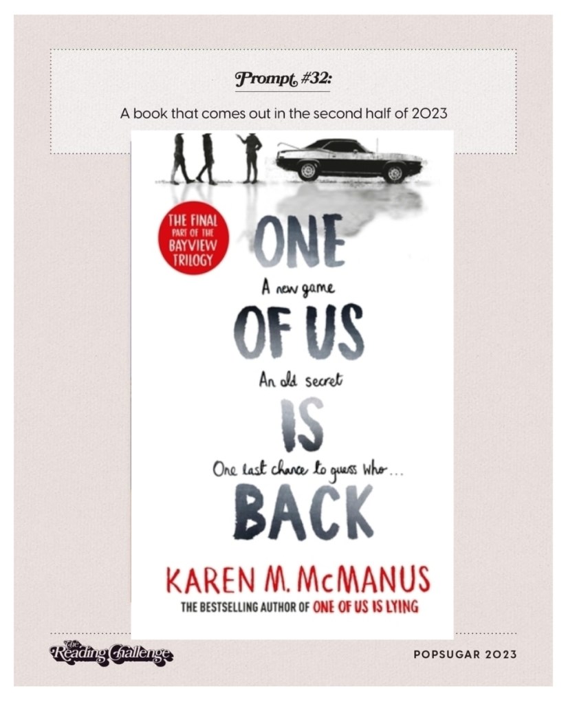 I have read all of Karen M McManus’ YA thrillers, so I was delighted to receive a gifted copy of One of Us is Back via Netgalley. Published in July, it is the perfect book for this prompt.