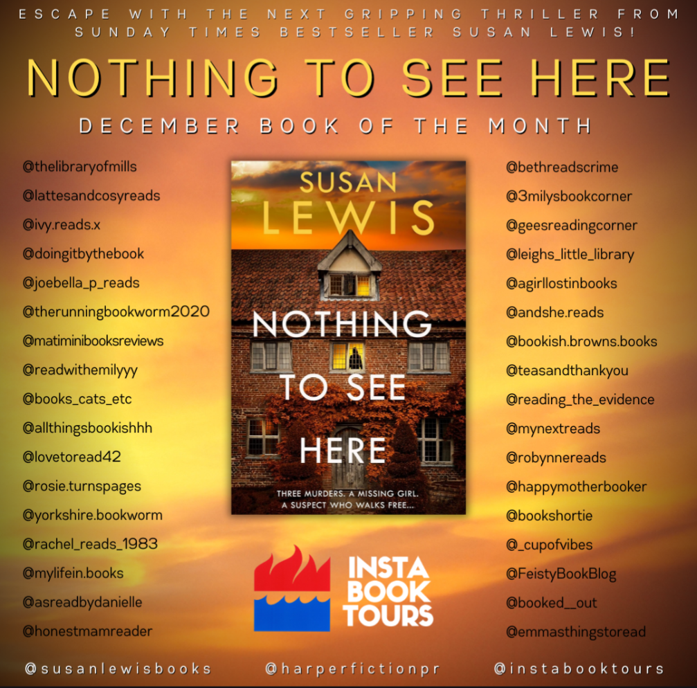 Thank you to Insta Book Tours for inviting me to be a part of this December Book of the Month Tour, and to Susan Lewis and Harper Collins for my gifted copy of Nothing to See Here.